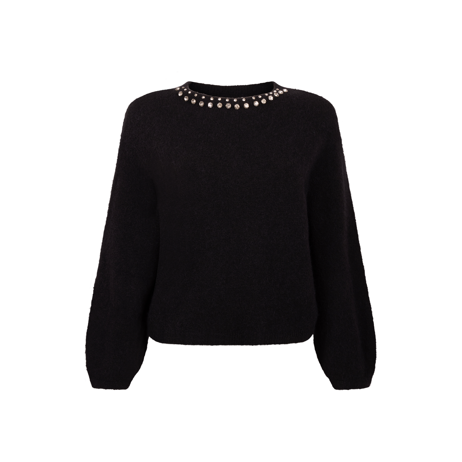 De Aaiko Daniela Strass WP Sweater in Black is een stijlvolle en comfortabele trui met een moderne, vrouwelijke pasvorm. De subtiele strassdetails geven de sweater een luxe en glanzende touch. In de klassieke zwarte kleur is dit een veelzijdig item dat zowel casual als chic gedragen kan worden.