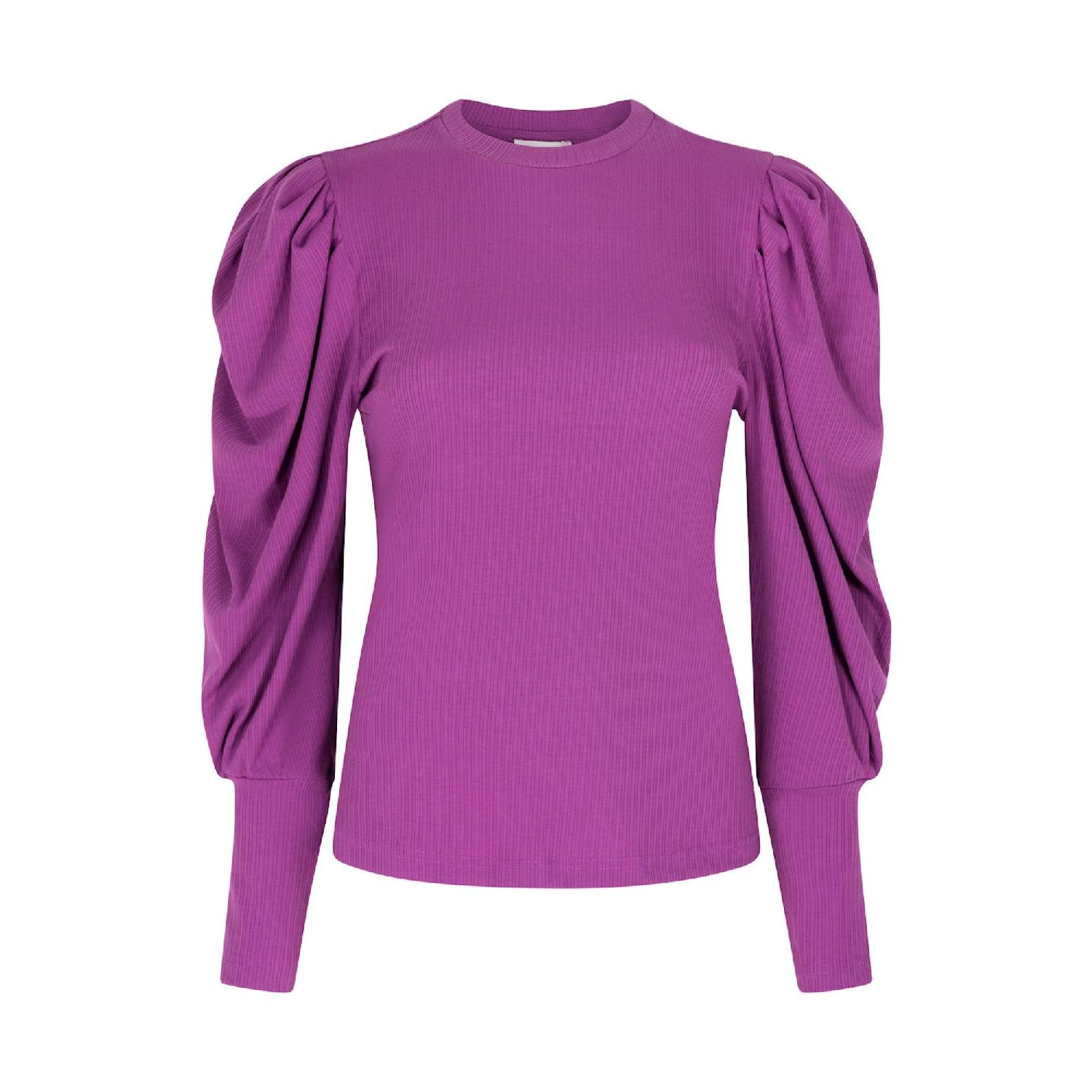 Deze top van Aaiko is paars van kleur. De top heeft een ronde hals en grote geplooide pofmouwen.