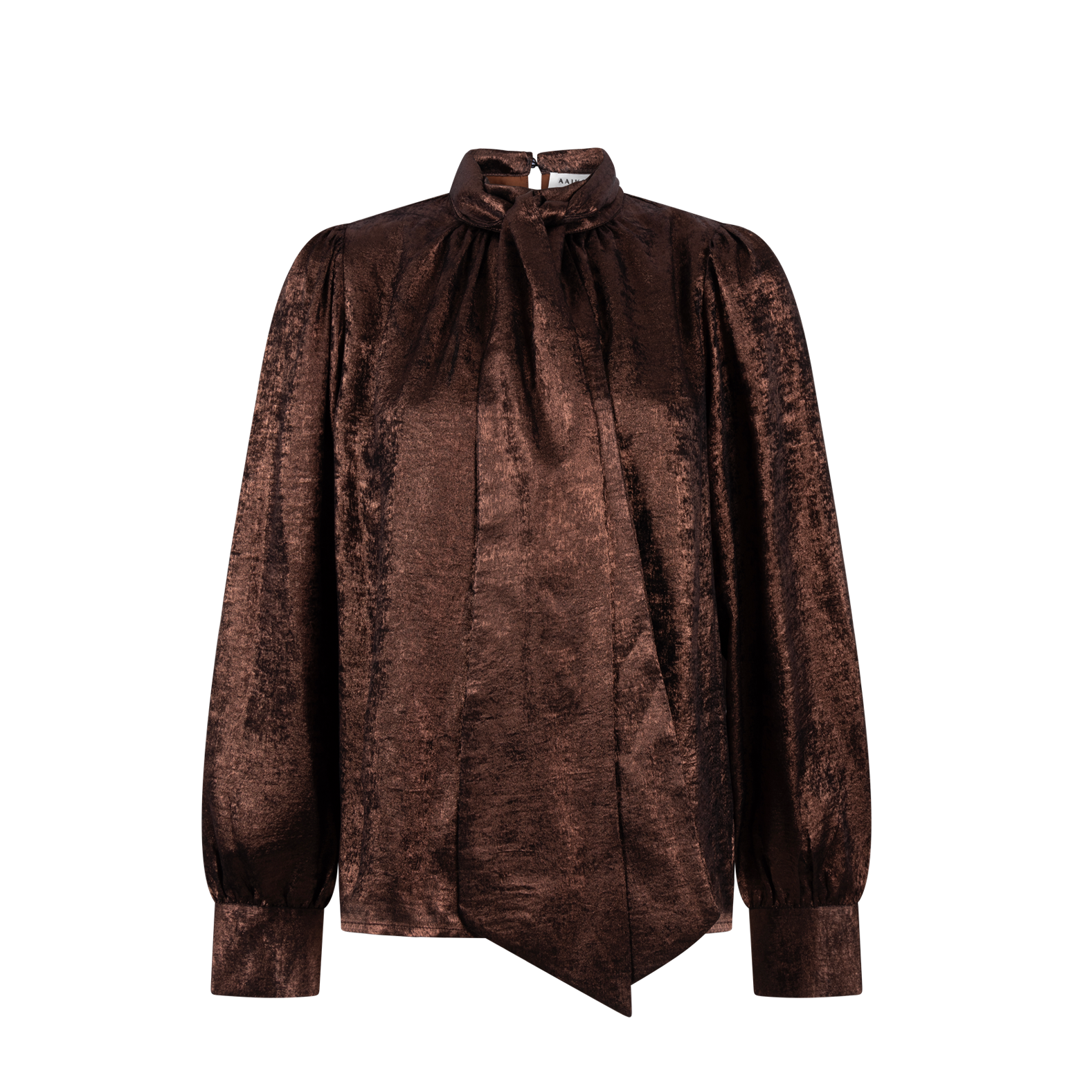 De Aaiko Quinty Bow PES Top in Copper is een elegante top met een vrouwelijke pasvorm en een opvallend strikdetail bij de hals. Het lichte, soepele materiaal zorgt voor een luxe draaggevoel, terwijl de warme copper tint een stijlvolle en chique uitstraling geeft. Ideaal om te combineren voor zowel feestelijke als casual looks.