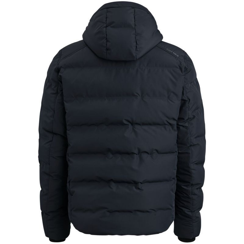 Deze jas van Cast Iron is donkerblauw van kleur. De jas is uitgevoerd in waterafstotend, 100% gerecycled polyester. De jas heeft een afneembare/verstelbare capuchon. De jas heeft twee steekzakken.