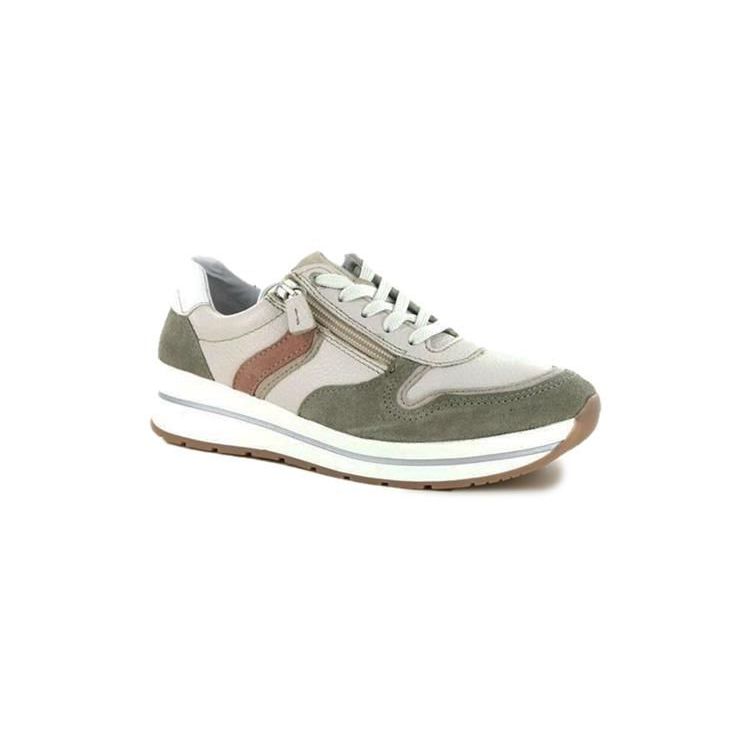 De Ruby is een witte leren sneaker met khaki en rose suede accenten op een sportieve rubberzool. Naast de vetersluiting heeft deze sneaker een ritssluiting voor het gemak. De binnenvoering en het uitneembare voetbed zijn van leer.