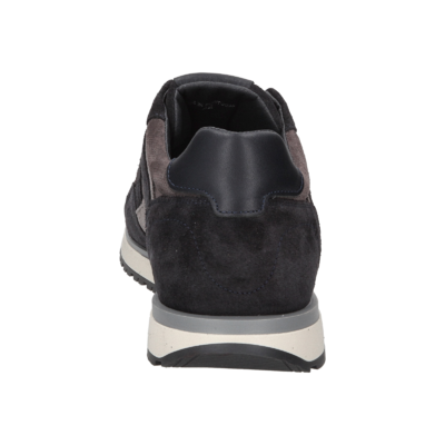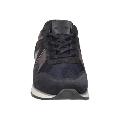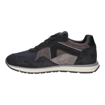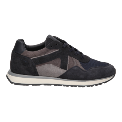 Donkerblauwe runner sneaker voor heren gemaakt van Navy suede met mesh materiaal en grijs suede en blauw leer accenten op de zijkant en op de hiel. De leren binnenvoering en het uitneembare voetbed zorgen voor een comfortabele pasvorm. De soepele rubberzool geeft goed grip en de witte tussenzool geeft de sneaker een sportieve uitstraling.