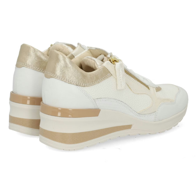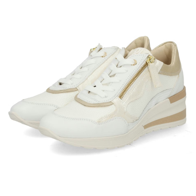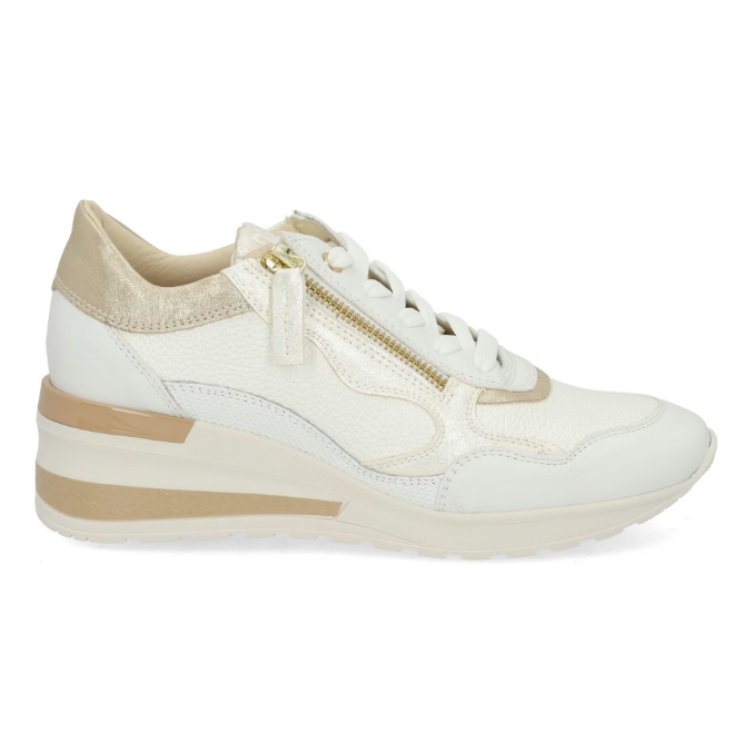 Deze wit leren sneaker voor dames is uitgevoerd in hoge kwaliteit leer met beige metallic en geprint leer accenten waardoor deze mooie sneaker een luxe uitstraling krijgt. Naast de vetersluiting heeft deze sportieve schoen is gemakkelijk ritsje. De comfortabel zacht leren binnenvoering en het uitneembare voetbed zorgen voor een optimaal draagcomfort. De soepele rubberzool met 4cm sleehak zorgt voor grip en comfort en geeft de schoen ook een geklede look zodat deze geschikt is voor elke gelegenheid.