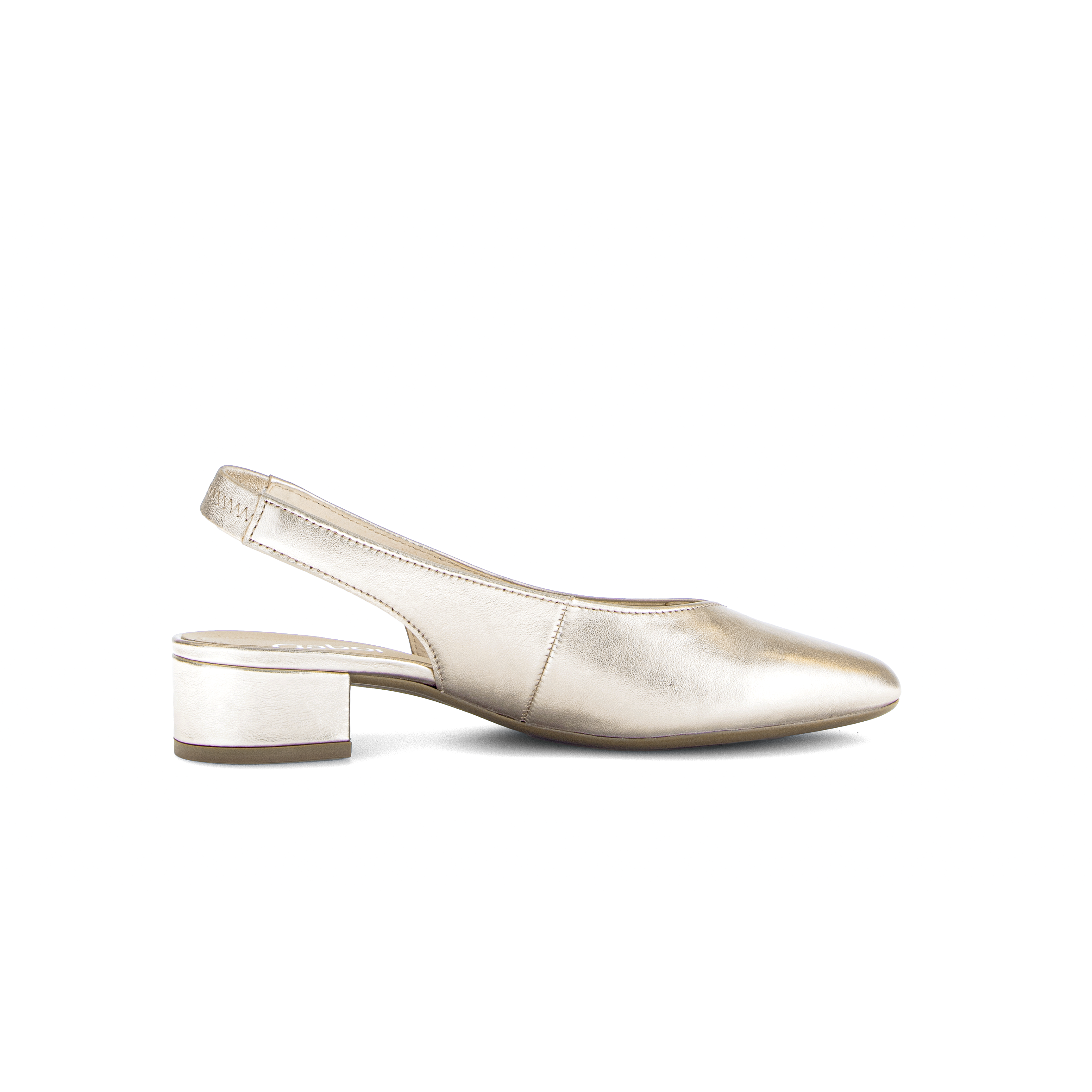 Deze slingback van Gabor is gemaakt van soepel leer met een shine metallic finish in de kleur Puder. Met de elastieke band in de hiel is de schoen makkelijk aan te trekken en blijft goed zitten tijdens het lopen. Het 30mm hakje loopt comfortabel en staat elegant in combinatie met het slanke leestje.