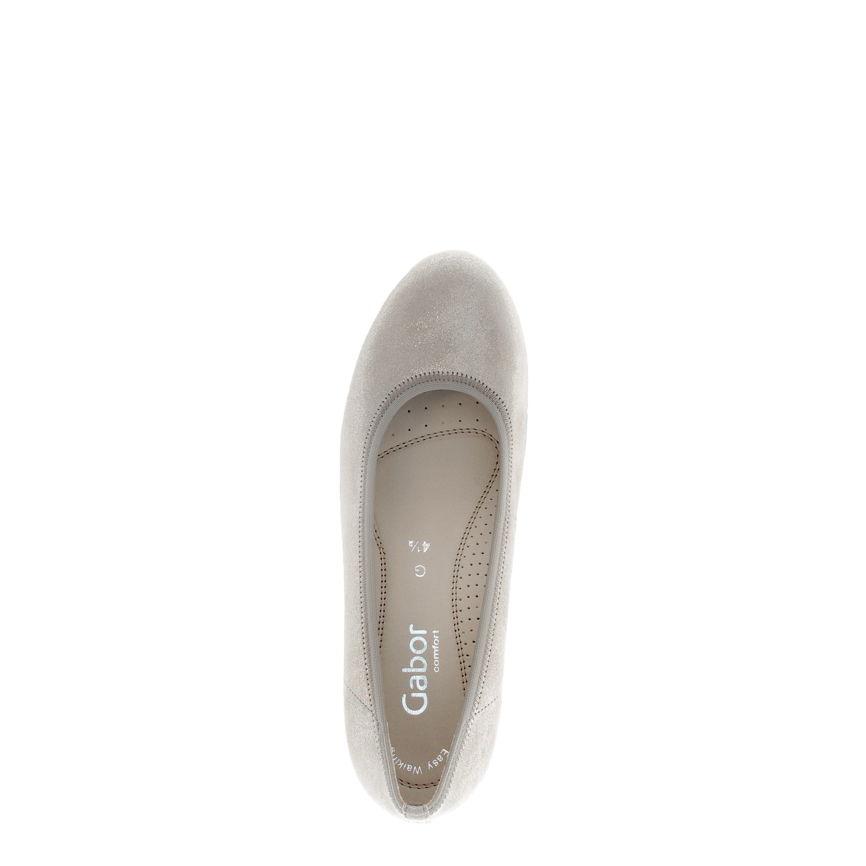 Deze beige ballerina voor dames is gemaakt van soepel nubuck met een fijne metallic finish. Dankzij de lage sleehak en de soepele rubberzool loopt deze ballerina zeer comfortabel. De tussenzool van kurk geeft de schoen een zomerse uitstraling. De zachte binnenvoering en het leren voetbed geven een comfortabel gevoel de hele dag lang. Combineer deze sportieve ballerina bij een zomerse outfit en je look is compleet.