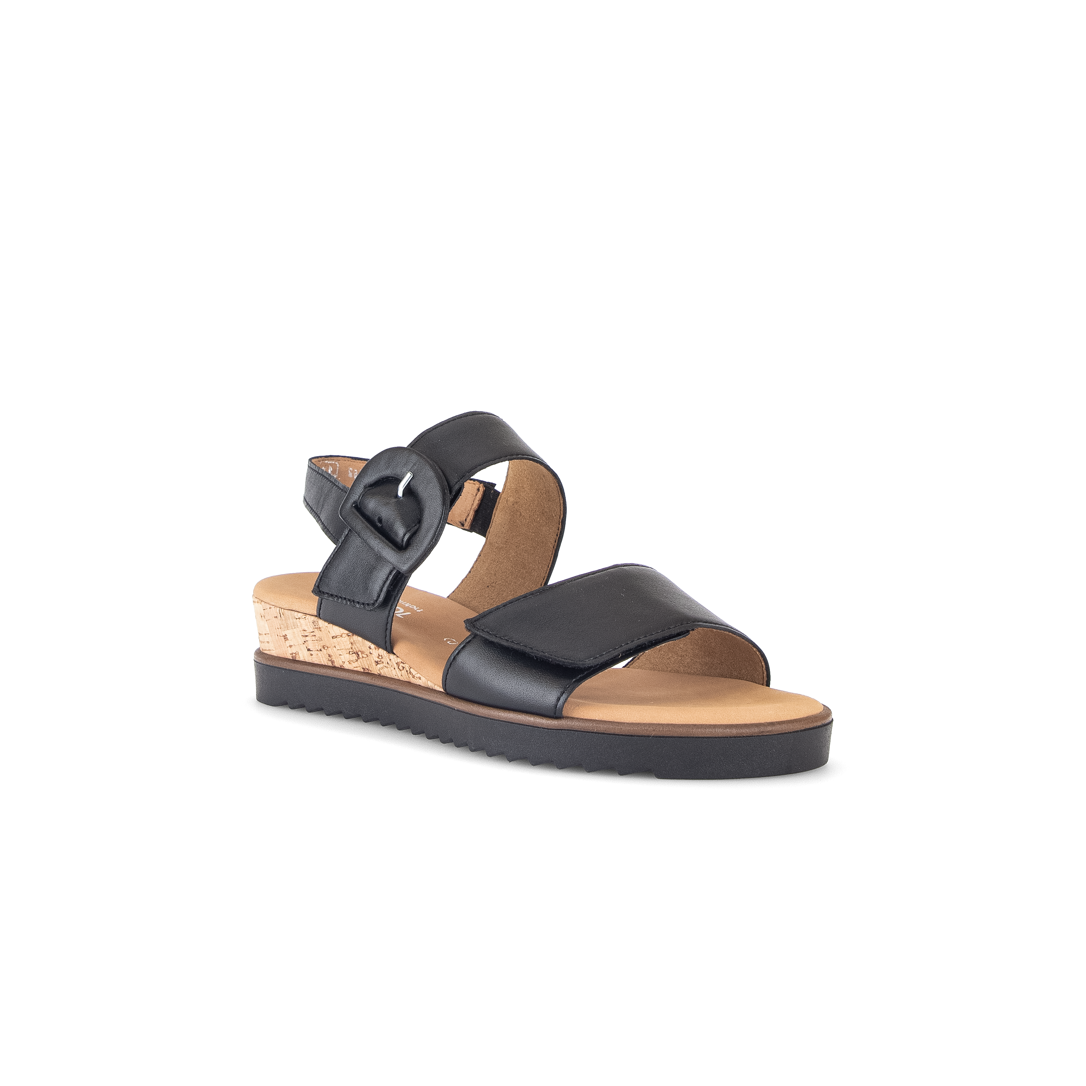 Deze comfortabele leren sandaal voor dames is gemaakt van mooie kwaliteit leer in de kleur zwart. De sandaal heeft een zacht leren band over de voorvoet en een subtiele klitteband sluitingen met siergesp over de wreef. Dankzij het zachte voetbed en de soepele rubberzool loopt deze sandaal super comfortabel. De lichte sleehak van kurk geeft de sandaal net wat meer elegantie en een casual look.