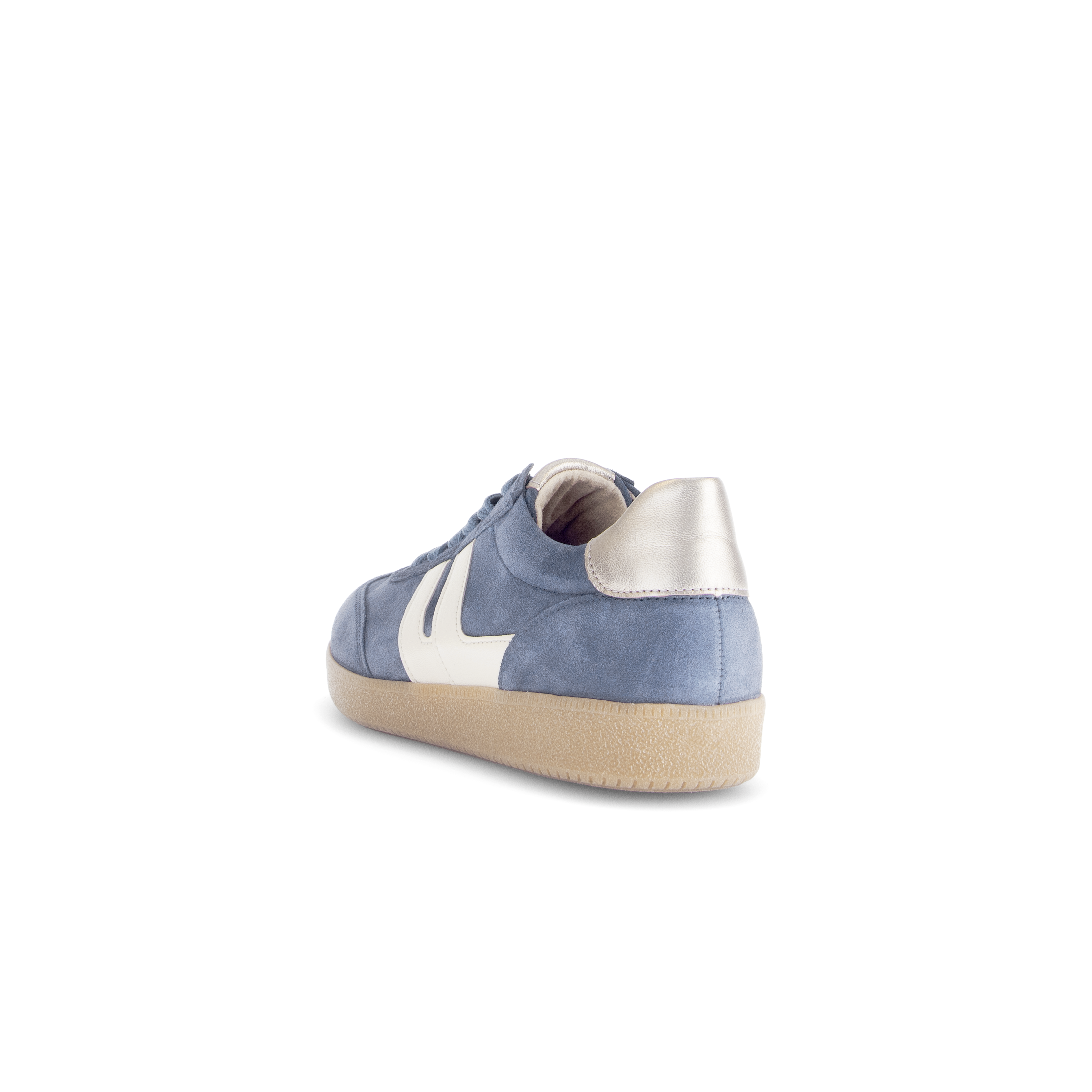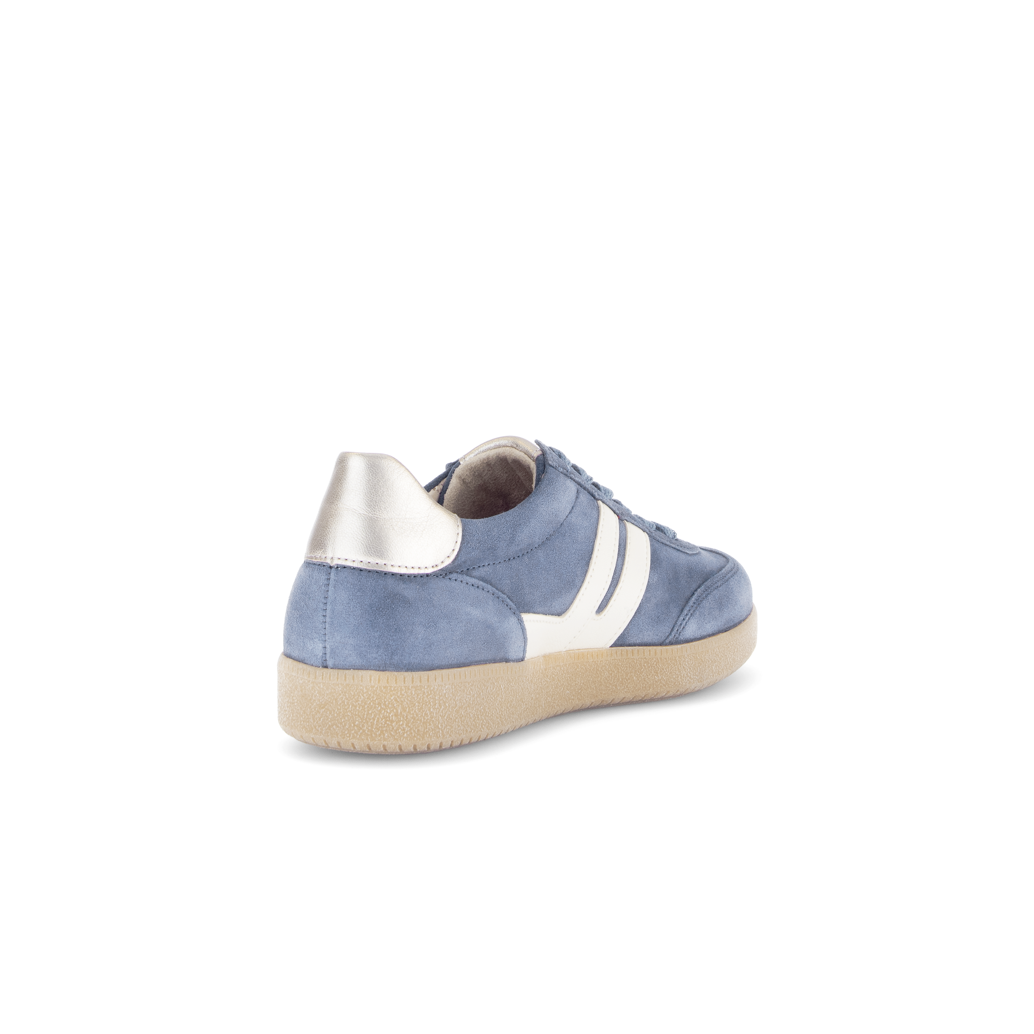 Deze Denim retro sneaker voor dames uit de Gabor Fashion collectie is gemaakt van jeansblauw suede met witte en metallic accenten op de zijkant en de hiel die de retro uitstraling versterken. De rubber gummi zool is soepel en geeft goede grip en demping. De binnenvoering en het uitneembare voetbed zijn gemaakt een combinatie van soepel leer en zachte stof.