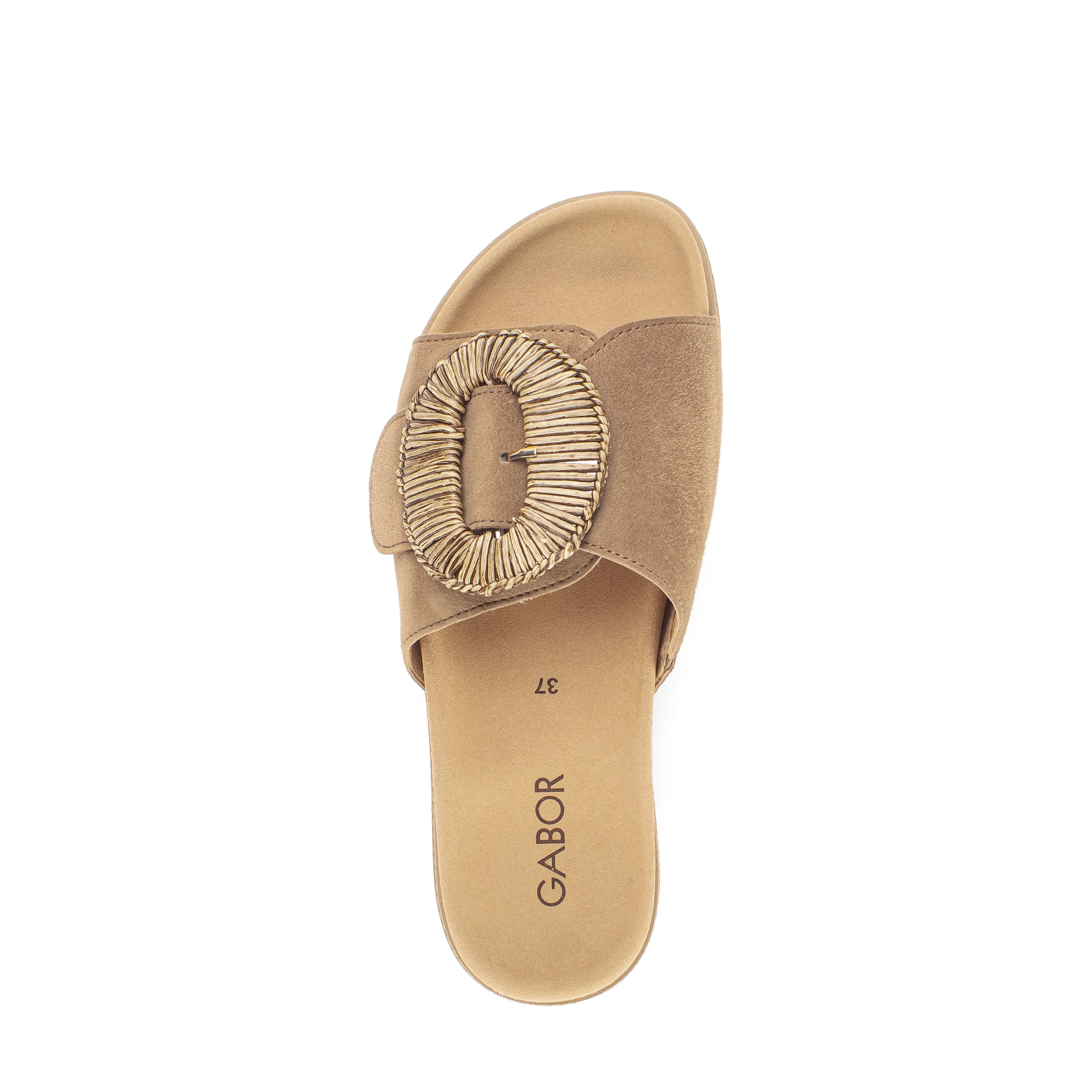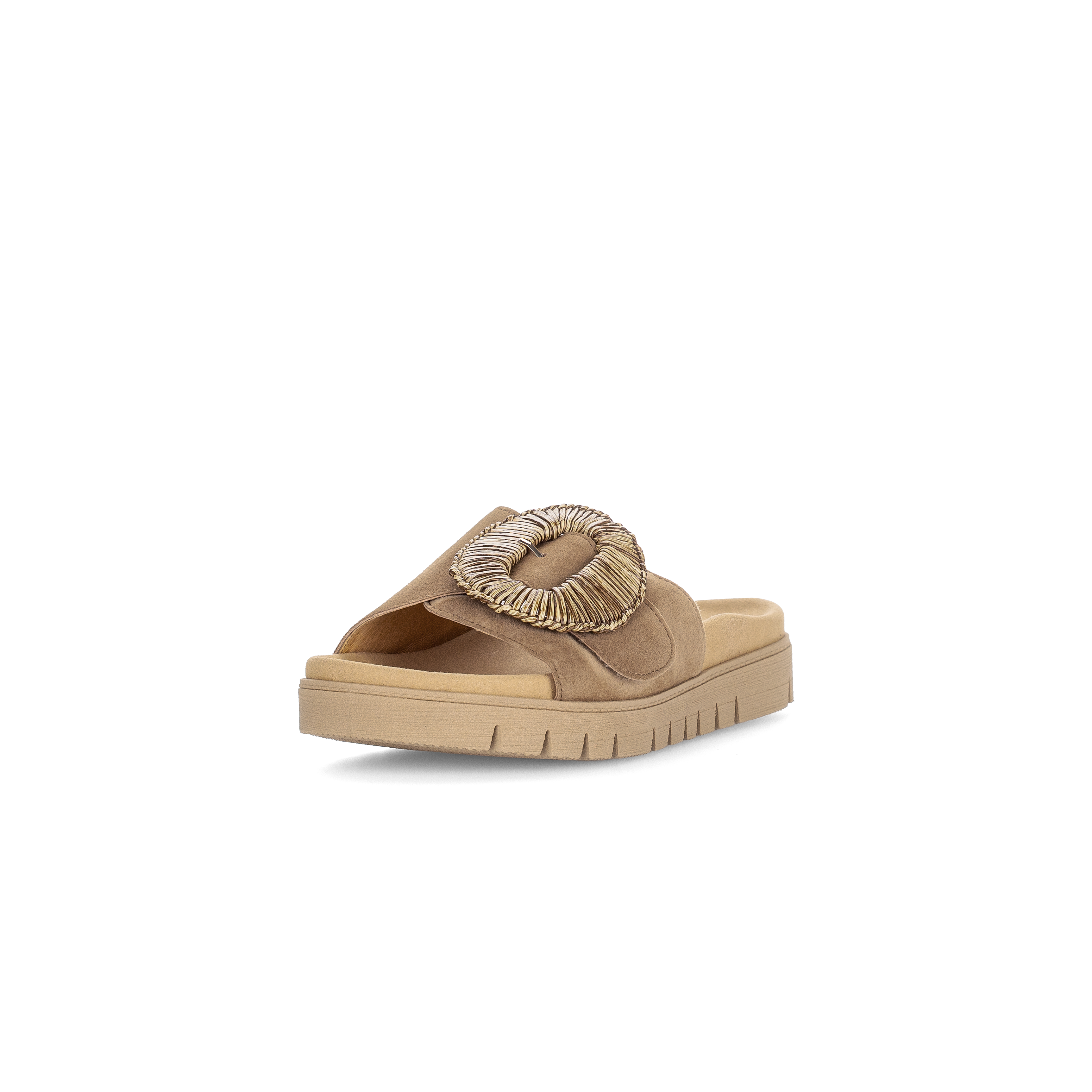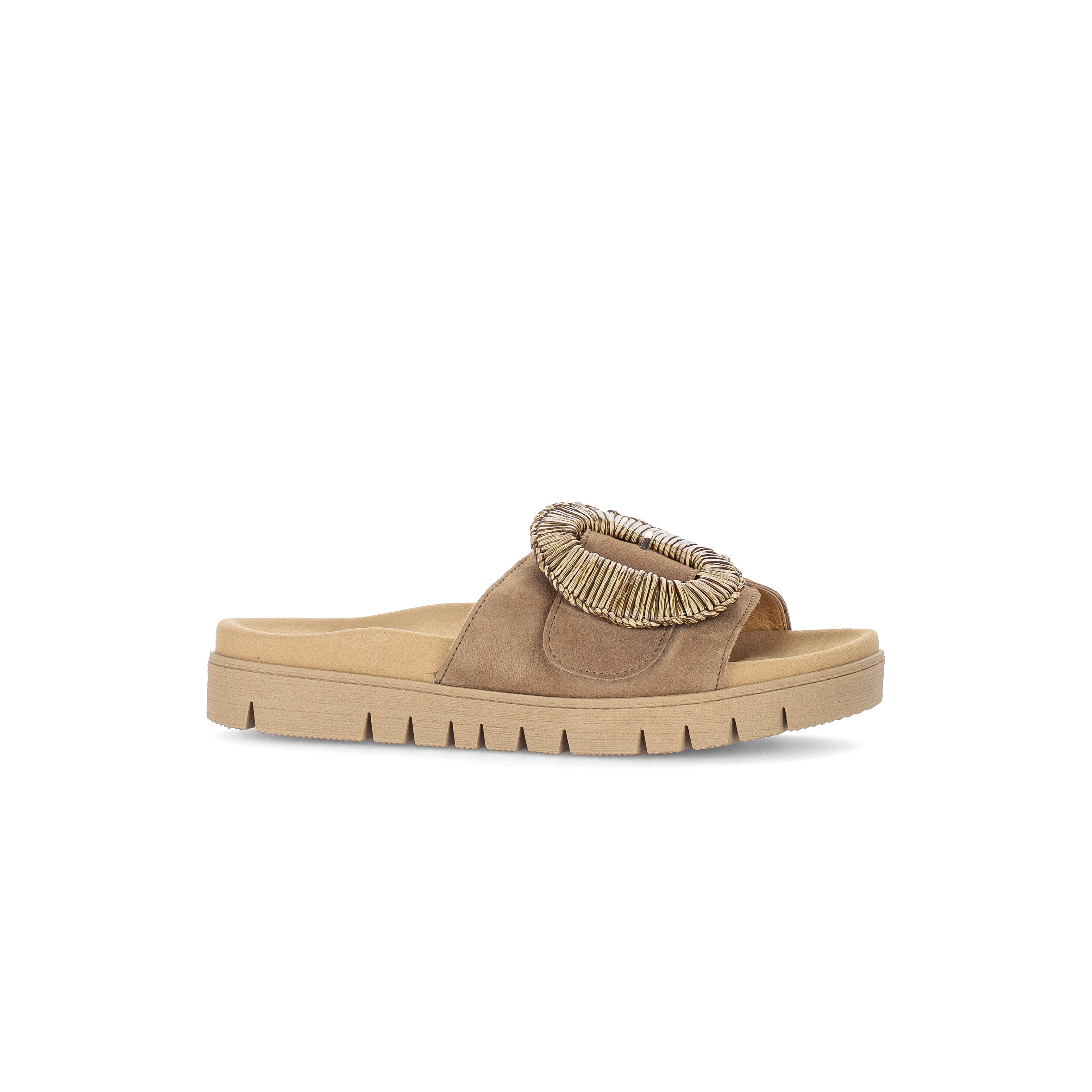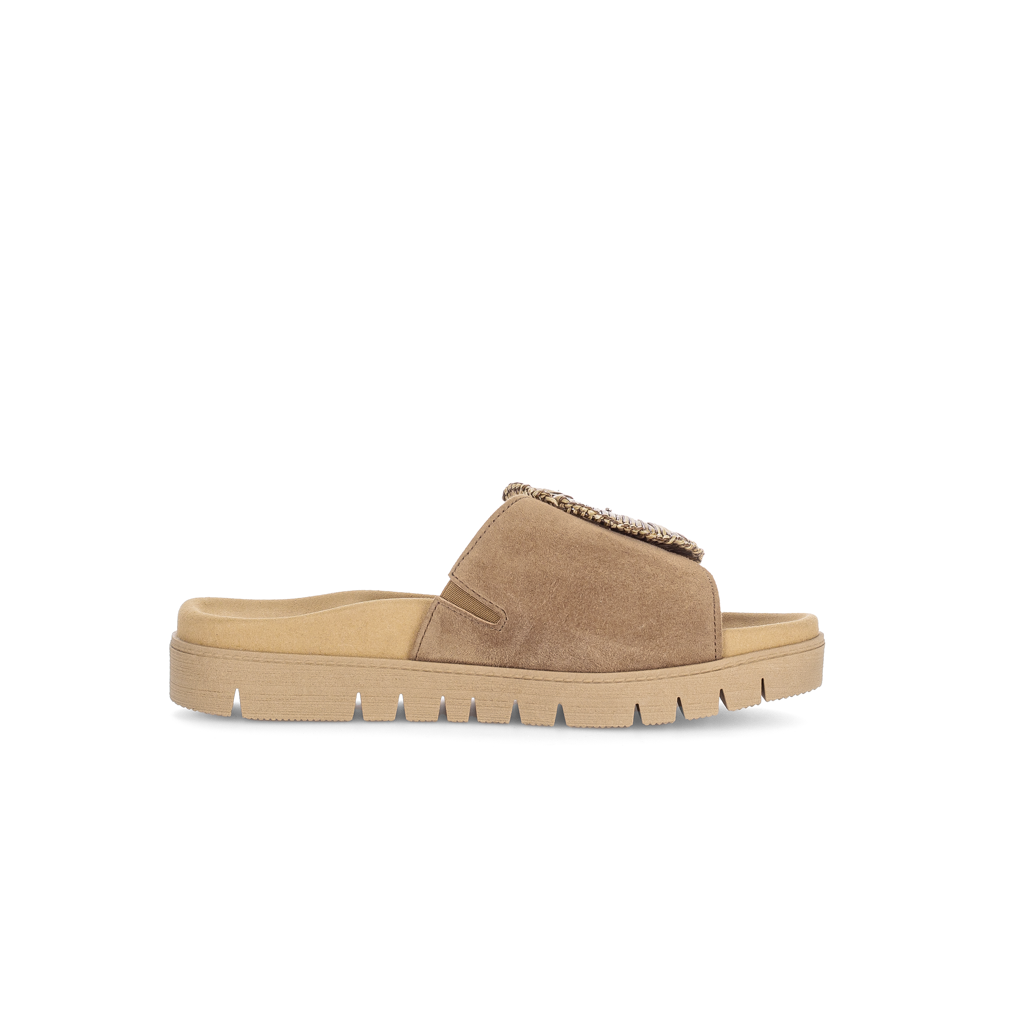 Luxe wreefband slipper 83.742 voor dames van Gabor. De slipper is gemaakt van soepel middenbruin suede met een grote ronde siergesp op een klittebandsluiting die perfekt rond de voet sluit. Het voorgevormde voetbed en de soepele rubber plateauzool zorgen voor een geweldig loopcomfort de hele dag. Match deze fashion slipper bij je casual of zelfs geklede outfit en je look is compleet.