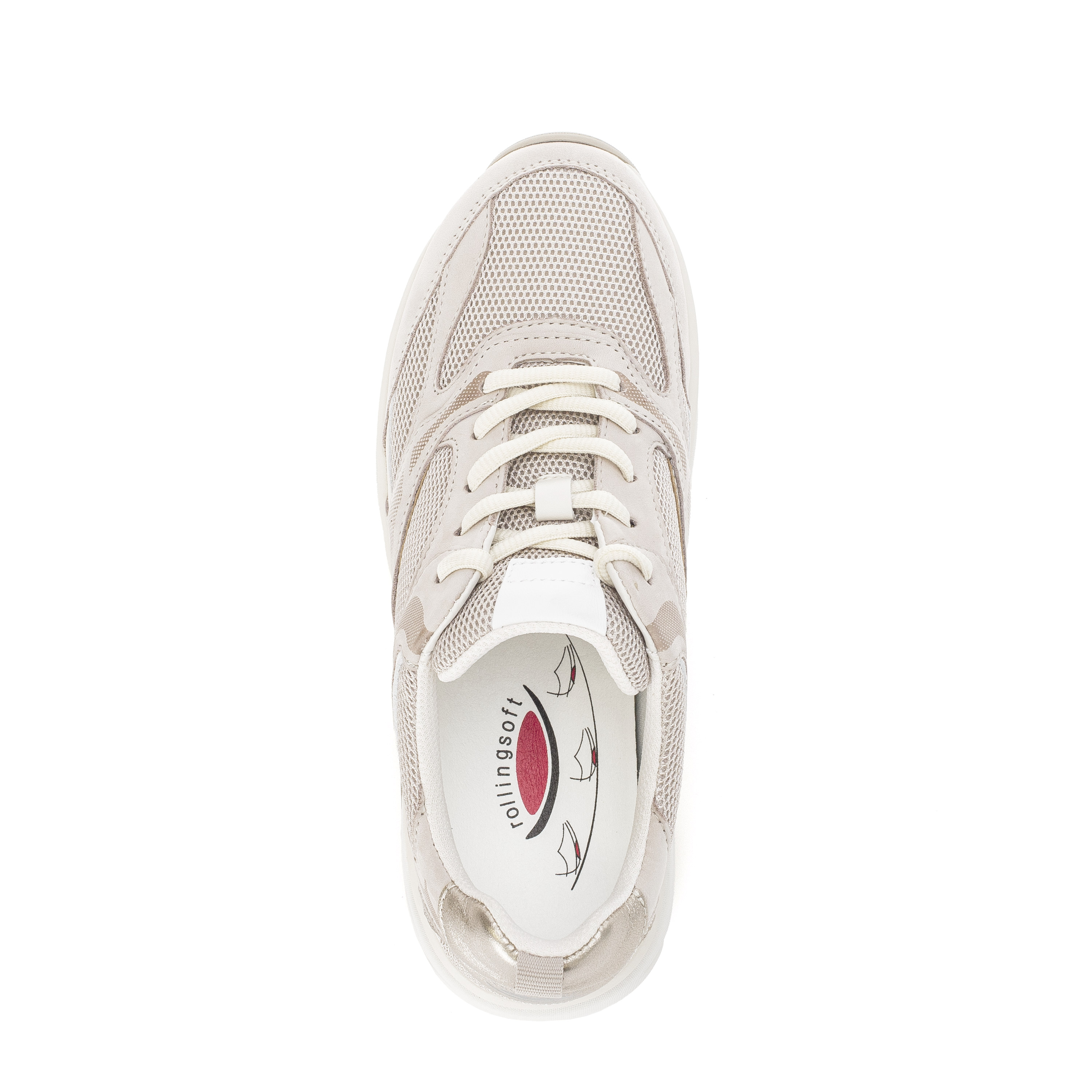Deze Pelr Puder Rolling Soft sneaker voor dames is gemaakt van een combinatie van verschillende materialen zoals beige leer, mesh en suede. De zachte binnenvoering en het uitneembare voetbed maken de sneaker geschikt voor het gebruik van een eigen voetbed. Dankzij de ruime pasvorm past deze lichtgewicht sneaker ook prima bij een bredere voet. Het lichtgewicht onderwerk met de bekende Rolling Soft afwikkelzool zorgt voor een comfortabel gevoel bij elke stap.