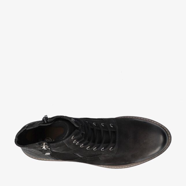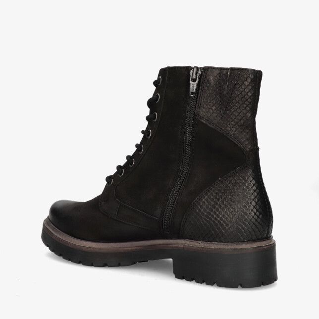Stoere zwarte veterboot van Helioform met een stevige profielzool en naast de vetersluiting 2 ritsen voor gemakkelijk aan en uittrekken. De wijdte is H dus extra breed en het leren voetbed is uitneembaar zodat ook een eigen zooltje gebruikt kan worden.