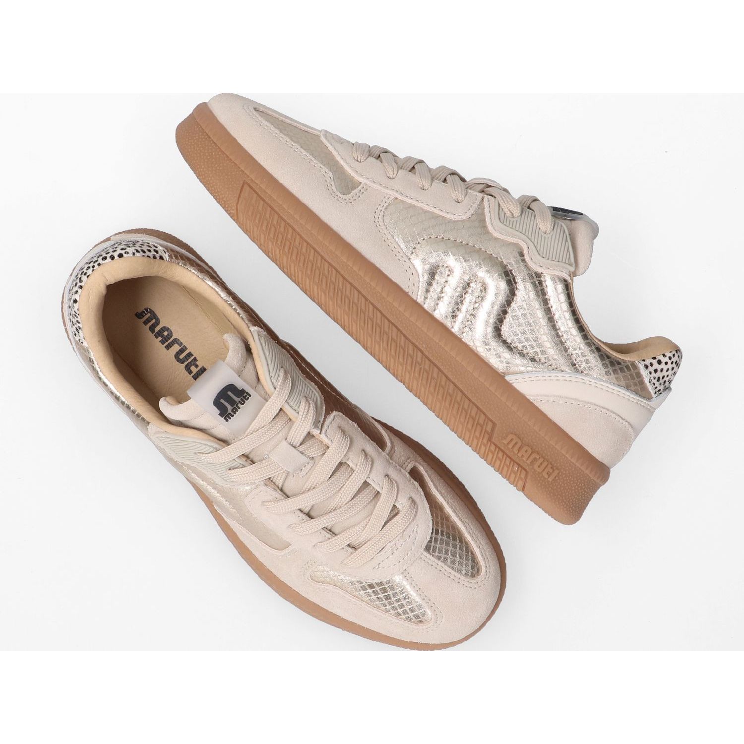 De Yale Leather Gold sneaker voor dames is gemaakt van beige suede en leer met een gouden finish en het bekende Maruti dierenprint accent op de hiel. Deze retro sneaker heeft een beige rubberzool die de schoen een vintage look geeft. De binnenvoering en het uitneembare voetbed zijn van leer wat voor een comfortabel gevoel zorgt bij elke stap. Match deze stijlvolle sneaker bij je zomerse outfit en je look is compleet.