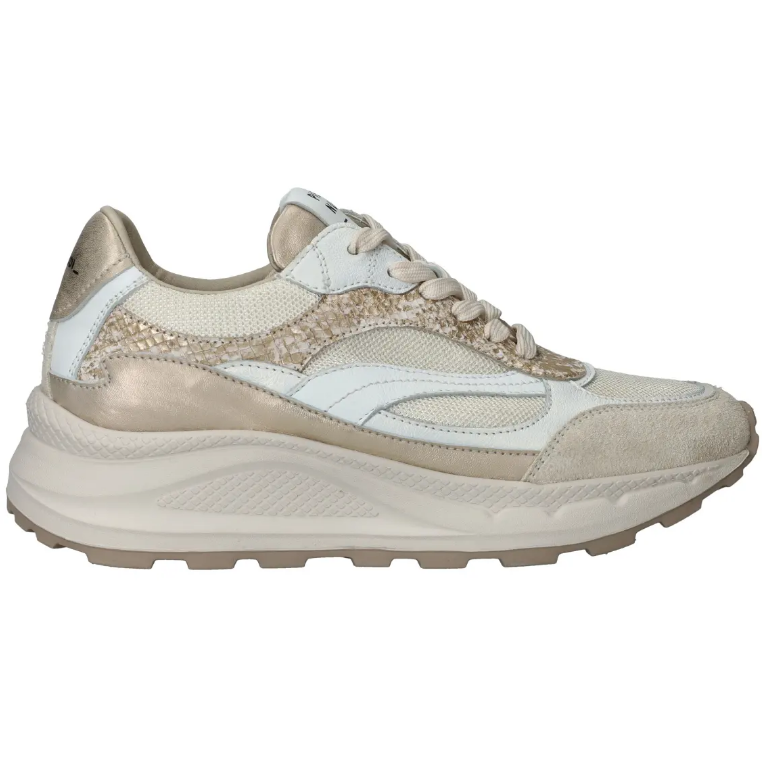 De Piedi Nudi West sneaker is een sportieve en comfortabele sneaker voor dames die mode en pasvorm perfect combineert. Dit model is speciaal ontworpen voor de bredere voet dankzij de H-leest, maar behoudt een slanke, vrouwelijke uitstraling. De zachte beige kleur met subtiele witte accenten geeft de sneaker een luxe en frisse look die makkelijk te combineren is. Het bovenwerk van leer, suede en mesh zorgt voor een rijke uitstraling en een ademend, soepel draagcomfort. De volledig leren binnenvoering draagt bij aan een prettig voetklimaat, ook bij langdurig dragen. Dankzij het uitneembare voetbed is de sneaker geschikt voor eigen steunzolen, zonder in te leveren op comfort of stabiliteit. De flexibele lichtgewicht zool en goede demping maken deze sneaker ideaal voor dagelijks gebruik. De West 01.06 is de perfecte keuze voor vrouwen die modebewust zijn en tegelijkertijd waarde hechten aan comfort, ondersteuning en een sportieve uitstraling.