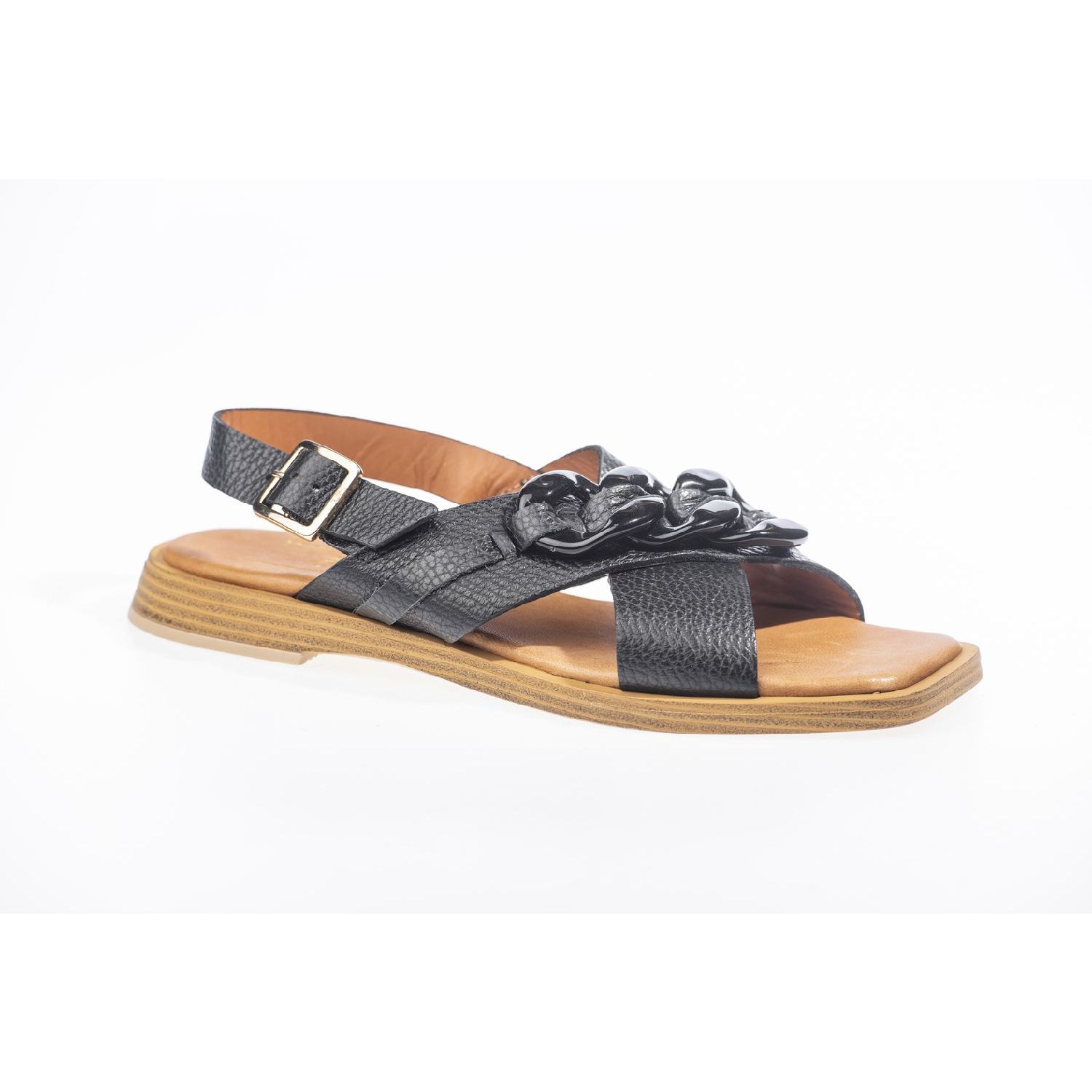 De Basha sandaal van River Woods is gemaakt op een rubberzool, het voetbed en de voering zijn leer. De sandaal heeft een kruisband over de wreef met een grote trendy versiering. De hielband is voorzien van een gesp met elastiek voor goede sluiting.