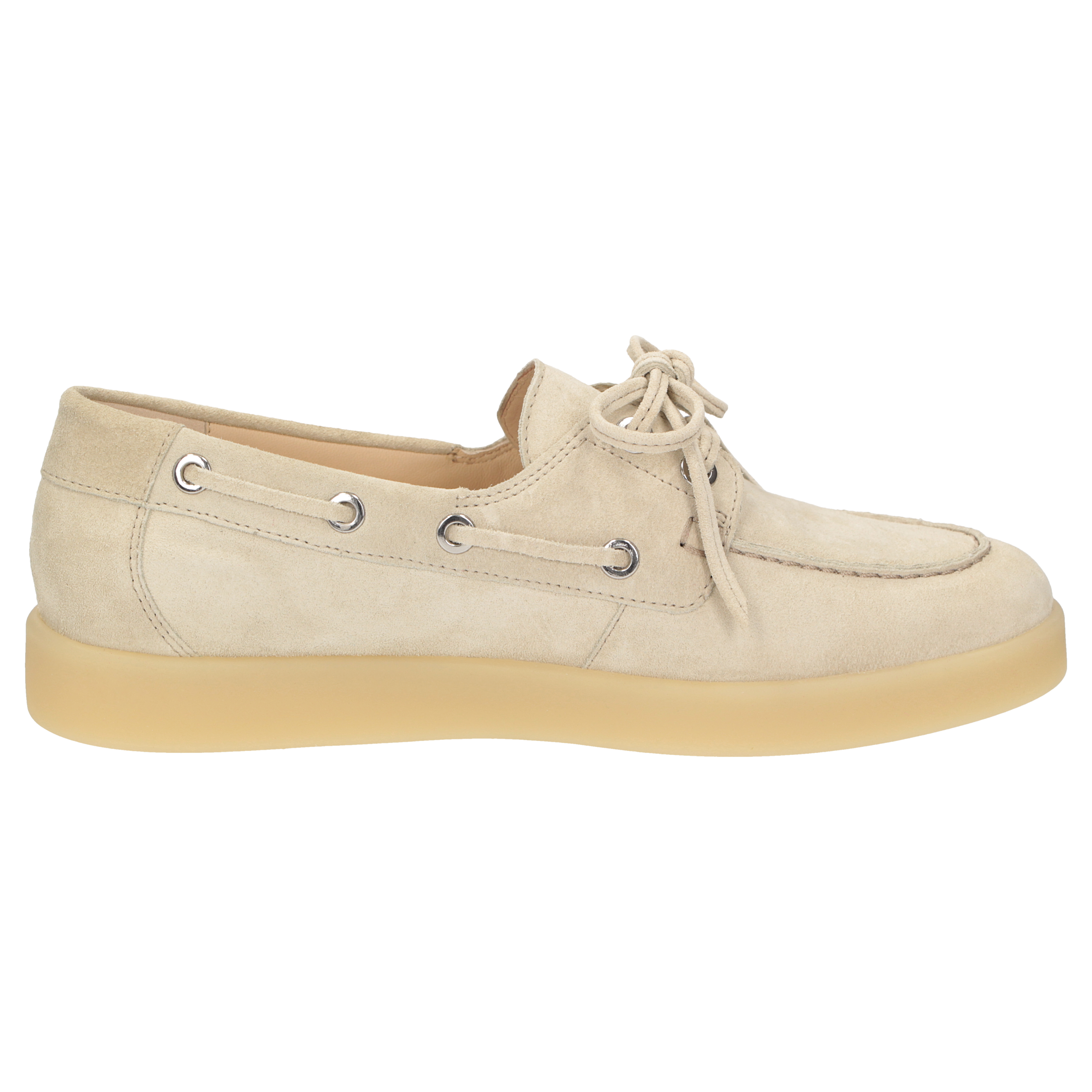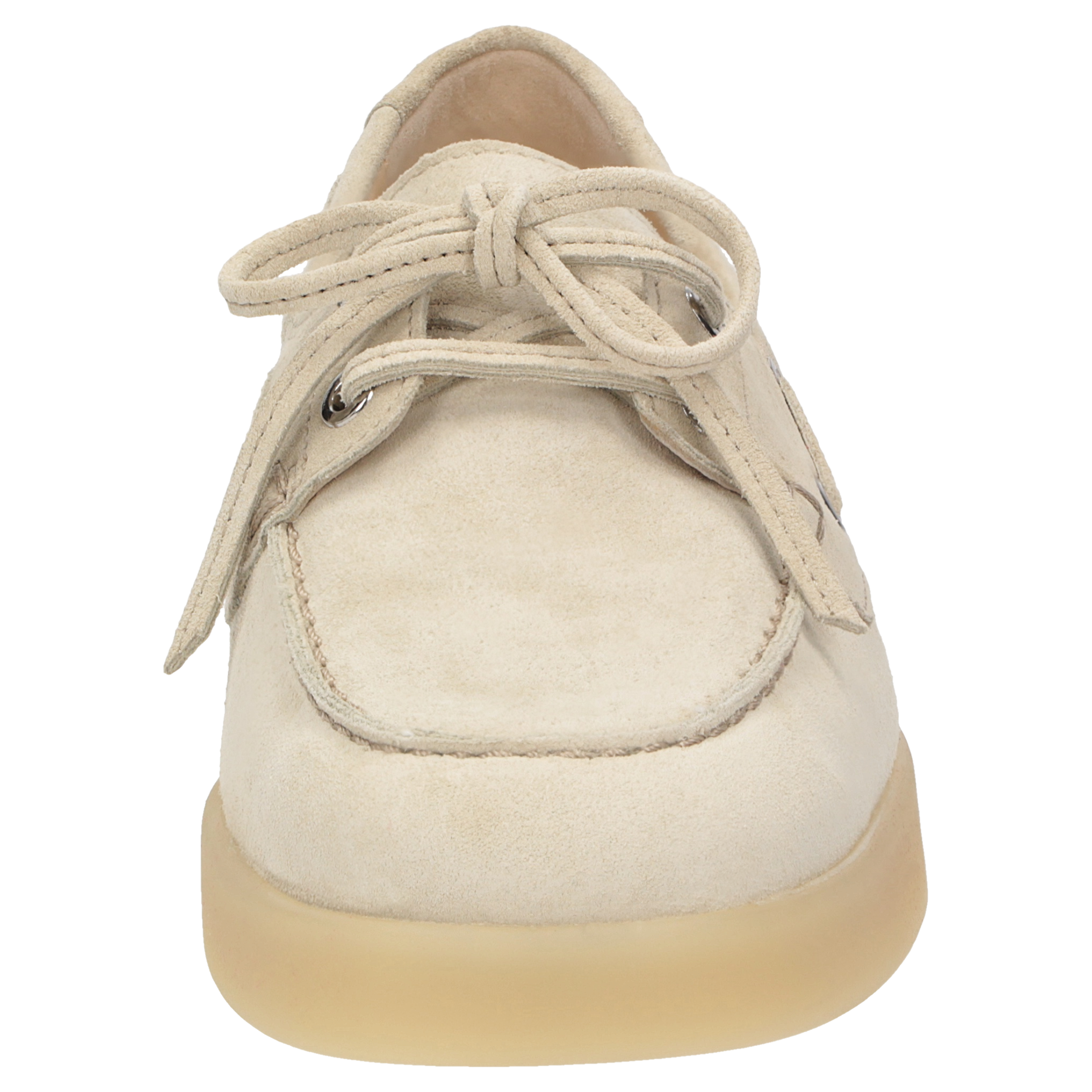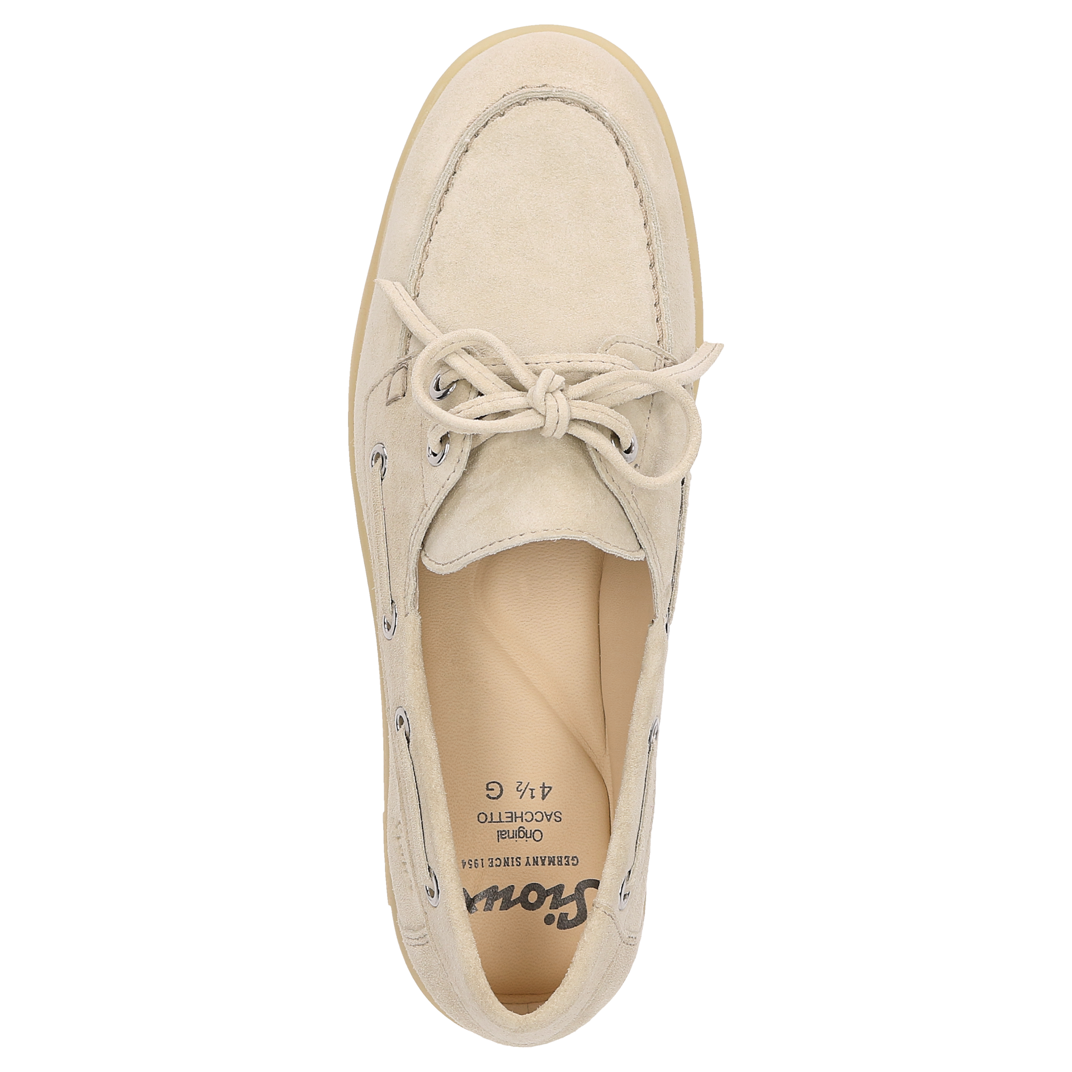 De Melosana Ivory is een bootschoen voor dames op een moderne rubberzool die goede grip en comfort geeft. De schoen heeft een klassieke uitstraling door de mocassin stiknaad op de neus en de doorgeregen veter. De originele sachetto maakwijze zorgt voor een optimaal voetcomfort mede door het gebruik van een soepel suede upper en een zachte kalfsvoering en binnenzool. Match deze trendy schoen bij je casual outfit en je stijlvolle look is compleet.