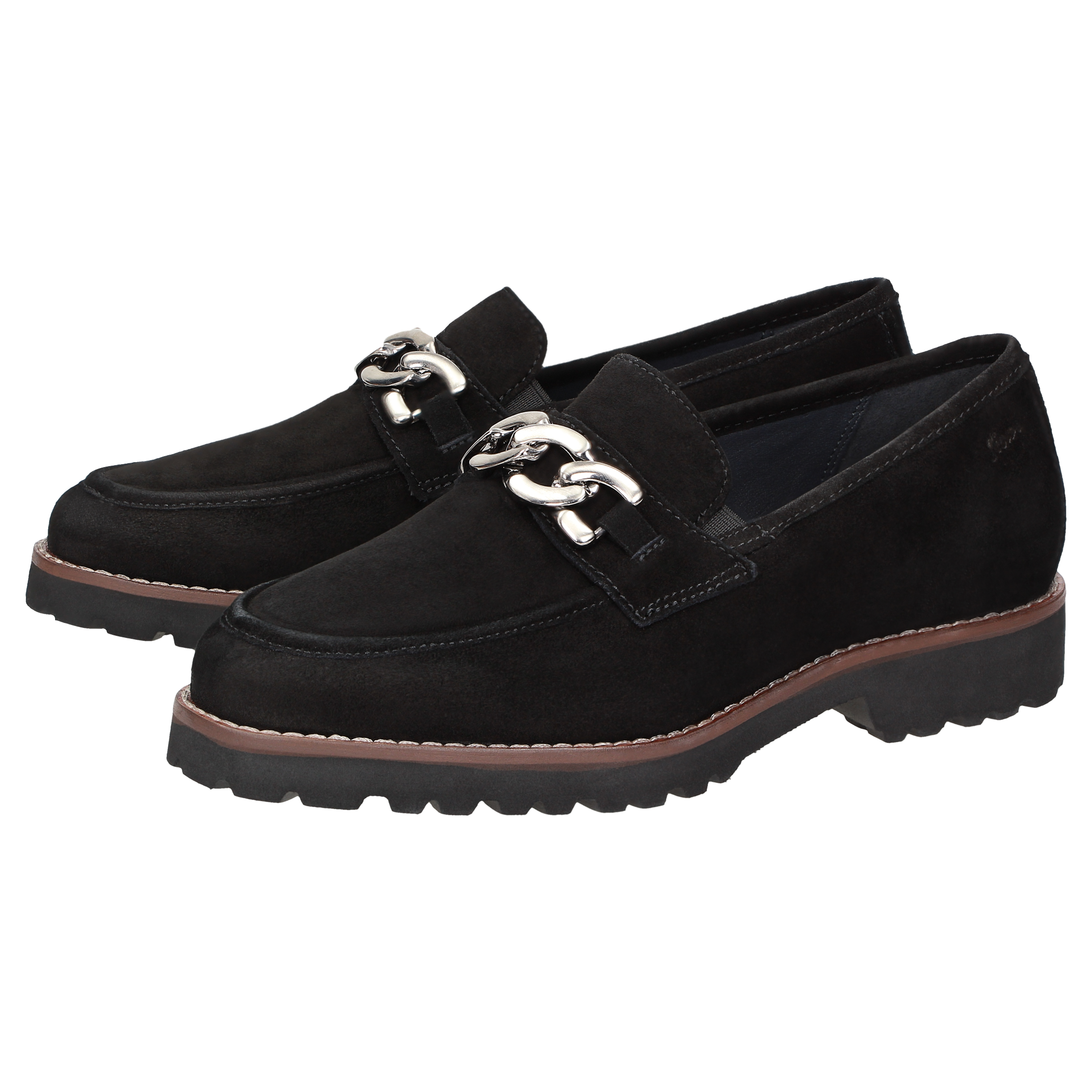 Dames-instapper in comfortabele H-extrawijdte, met klassiek metaal-element en elastiek-inzetten aan de tong - voor een perfecte pasvorm. Gemaaktvan zeer zacht Zwart lamssuède en gevoerd met leer, met stretchvoering rond de voorvoet. Geschikt voor hallux-valgus-voeten! Uitneembare, met leer beklede dekzool, met zachte demping - ook geschikt voor de eigen inlegzool. Geprofileerde, herfstachtig ogende lichte rubberzool met markante leerrand.