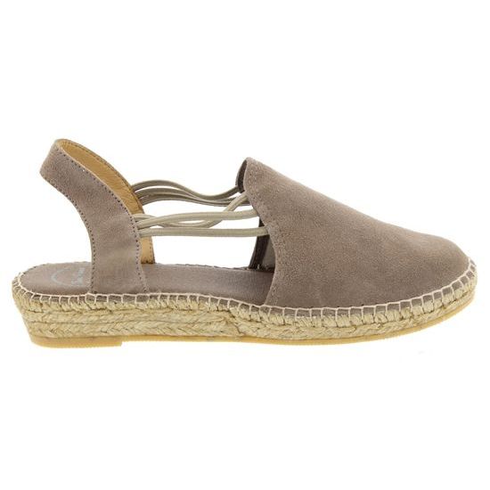 Toni Pons Nuria Taupe is een suede espadrille op een platte touwzool met elastieke sluiting.