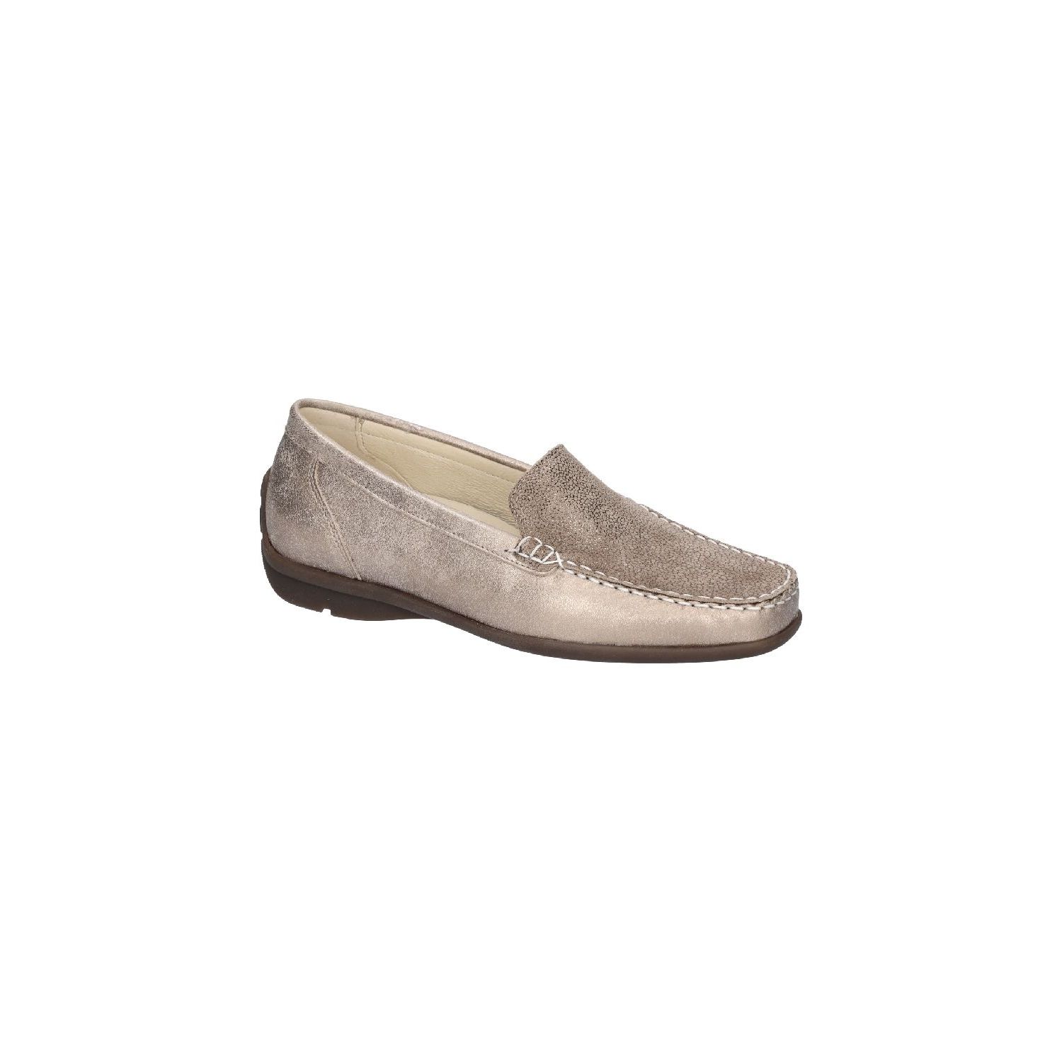 Deze beige gouden loafer voor dames is gemaakt van beige leer met een subtiele print en lichte goudmetallic finish. De mocassin heeft een soepele rubberzool die grip en veel loopcomfort geeft. De binnenvoering en het uitneembare voetbed zijn van comfortabel zacht leer. De wijdte van deze instapper is "H" dus geschikt voor de brede voet en een eigen voetbed.