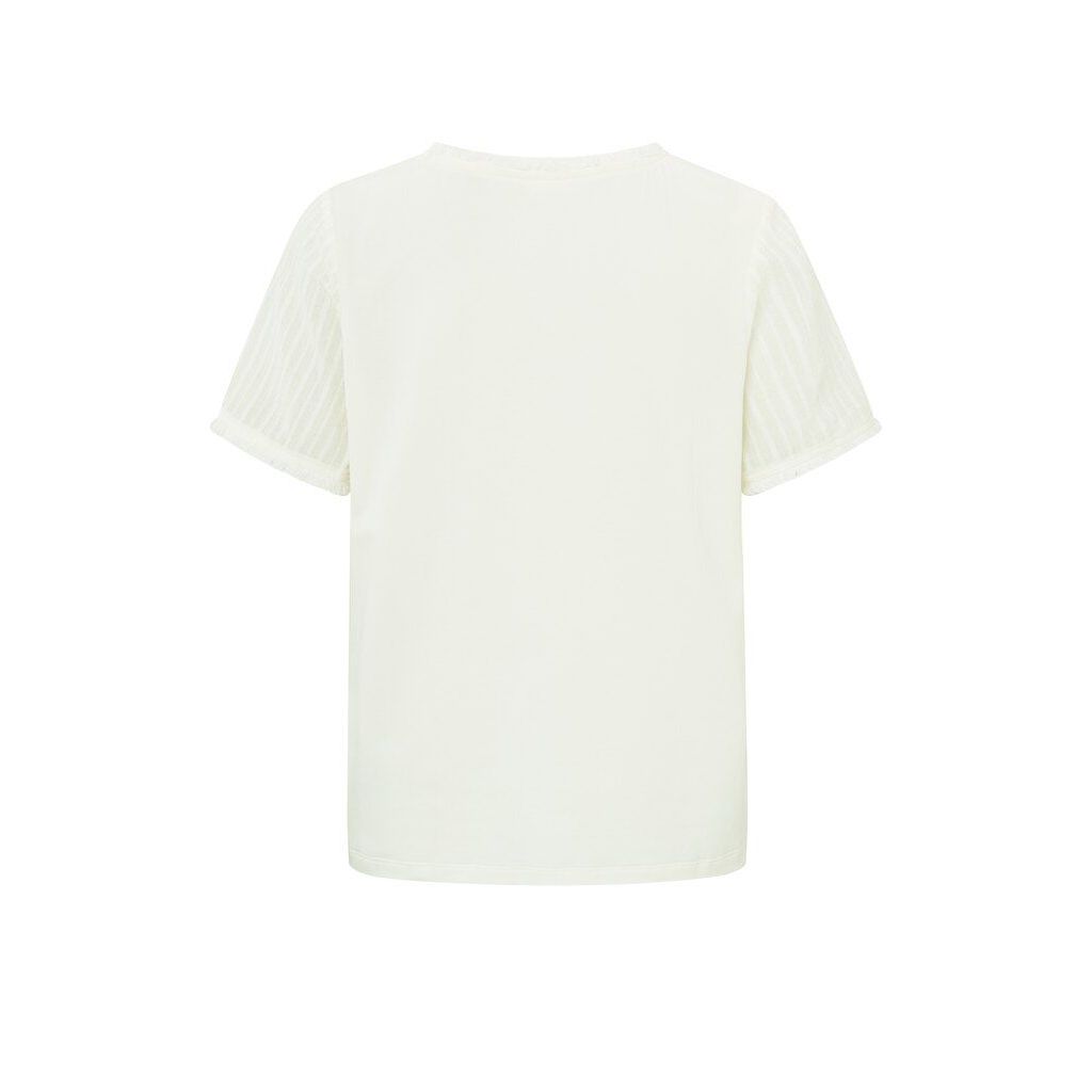De Yaya stofmix top met franjes in ivoorwit is een eigentijds kledingstuk dat chic toevoegt aan elke outfit. Gemaakt van een zachte, soepele stofmix, biedt dit topje zowel comfort als stijl. De ivoorwitte kleur voegt een tijdloze elegantie toe. De top heeft een moderne pasvorm en leuke franjes aan de mouwen. Op de voorkant van de top lopen verticale strepen.