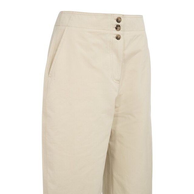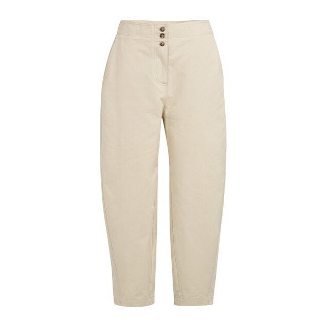 Het barrel leg model is een echt modestatement: de broek zit hoog in de taille, loopt bolvormig uit bij de bovenbenen en knieën, en versmalt weer subtiel richting de enkels. Dit volume geeft je outfit direct een moderne, "high-fashion" uitstraling, terwijl de hoge taille je silhouet prachtig accentueert. De zachte zandkleur in combinatie met deze pasvorm maakt het een item dat zowel zakelijk als ontspannen gedragen kan worden.