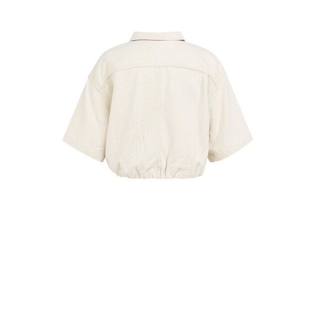 Het unieke aan dit item is de materiaalkeuze: het heeft de looks van een authentiek denim jack—inclusief de karakteristieke borstzakken, kraag en metalen knopen—maar de feel van een soepel vallend jasje. Hierdoor beweegt het jack prettiger mee en valt het mooier langs het lichaam, wat zorgt voor een vrouwelijk en elegant silhouet.